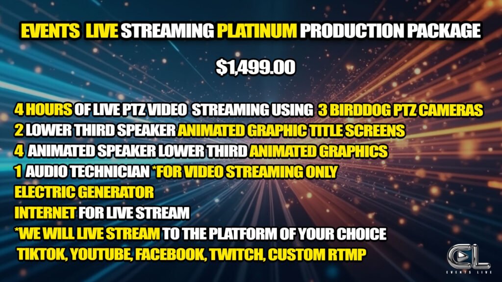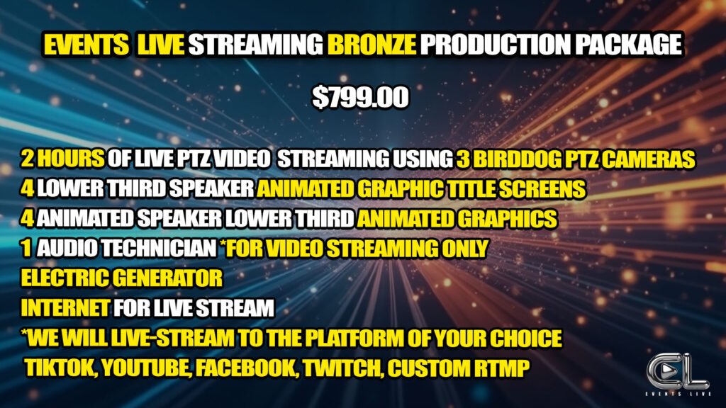 What sets Events Live apart is our all-inclusive production crew and technology. We arrive fully equipped with everything needed to broadcast, including our own electric generator, high-speed internet, and professional PTZ cameras powered by NDI technology. This allows us to stream in any situation—even in remote locations like open fields—without limitations. With the ability to operate up to three PTZ cameras, we can deliver dynamic, multi-angle coverage streamed directly to your preferred platforms such as YouTube, Facebook, or OTT services.